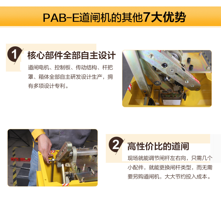 PAB-E型道閘機是公司最近批量生產的新品道閘機,此閘機有多個亮點:一是閘機左右向隨便換;二是更換閘桿類型無需另購道閘機;三是伺服功能,自行調節閘桿平穩度,減少抖動;四是故障自檢功能,大大提高故障解決速度;五是互聯網功能,直接用手機APP,控制閘機的升降,調速,定點停等功能。。。